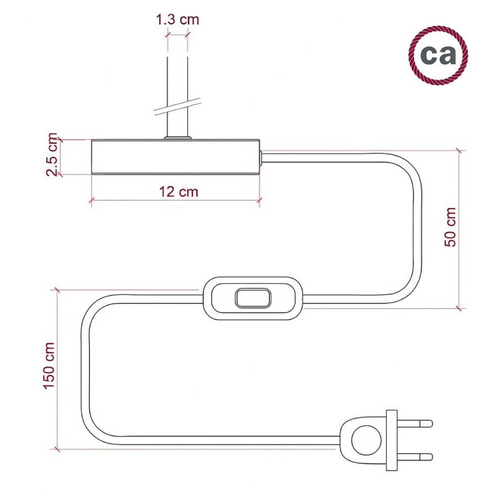 Kerek Creative-Cables kábel szövetborítással: 2 méter (150 cm a foglalattól a kapcsolóig + 50 cm a kapcsolótól az Alzaluce-ig) 2x0,75, HAR tanúsítvánnyal. Olaszországban gyártva