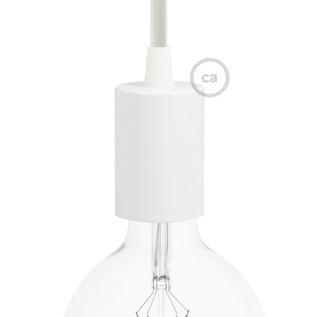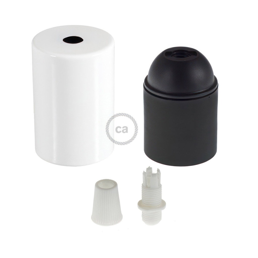 Hengeres lámpafoglalat-készlet, amely E27 lámpafoglalatból és hengeres fém kábelbilincsből áll, ideális kedvenc textil kábelével és mennyezeti rozettájával (külön megvásárolható) való használatra.