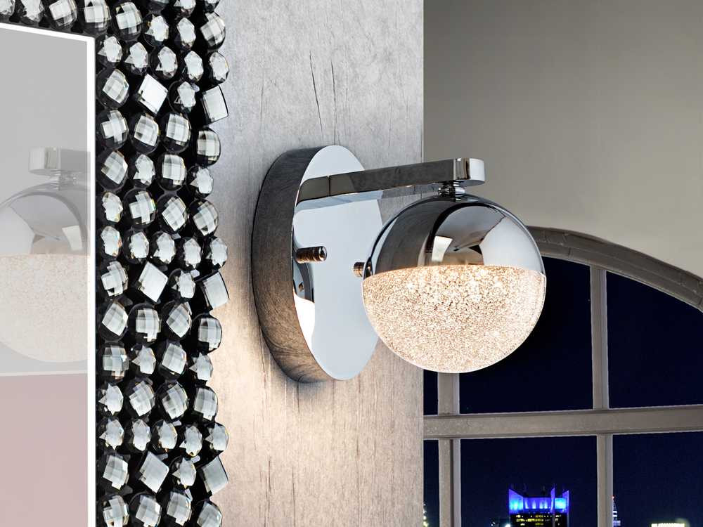 1 izzós LED fali lámpa, fémből, krómozott felülettel. 12 cm átmérőjű polikarbonát gömbbura, belül texturált díszítéssel és krómozott fémmel. 4,8 W LED. 3000 K. 336 lm.
