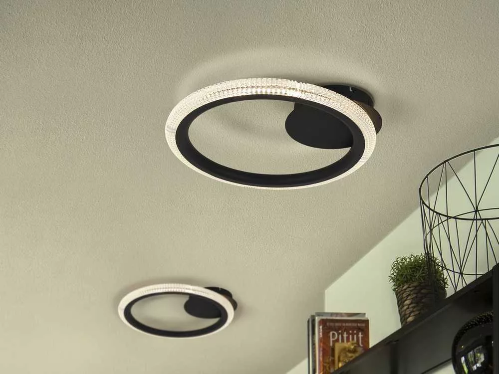 Mennyezeti vagy fali lámpa fémből és alumíniumból, csiszolt matt fekete felülettel. Gyűrű átlátszó akril diffúzorral. 14 W LED. 893 lm. 3000 K.