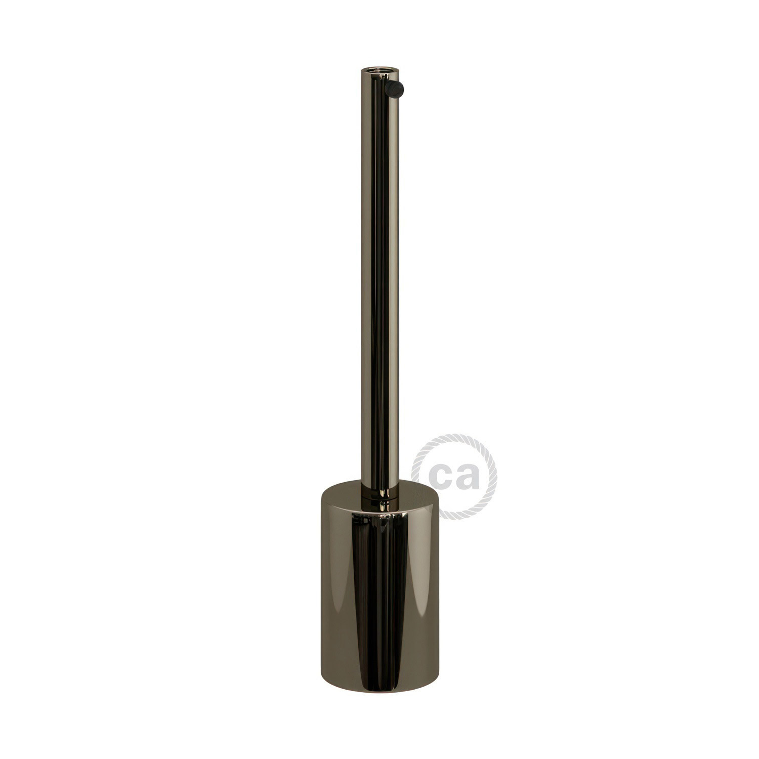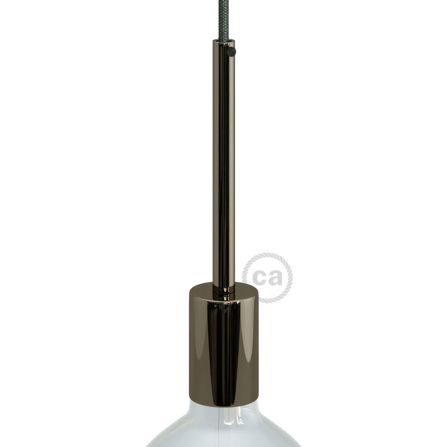 Hengeres lámpafoglalat-készlet, amely egy E27-es lámpafoglalatból, egy 15 cm-es hengeres fém kábelbilincsből és a mennyezeti rozettából áll, és a kívánt textilkábelhez használható.