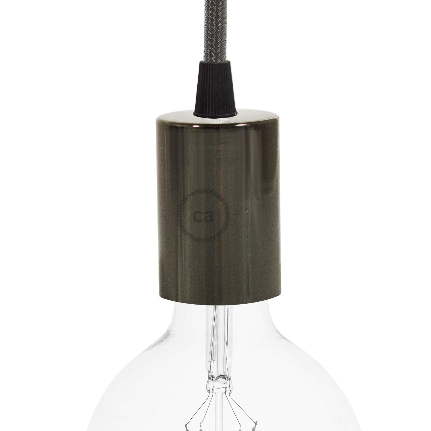 Hengeres lámpafoglalat-készlet, amely E27 lámpafoglalatból és hengeres fém kábelbilincsből áll, ideális kedvenc textil kábelével és mennyezeti rozettájával (külön megvásárolható) való használatra.