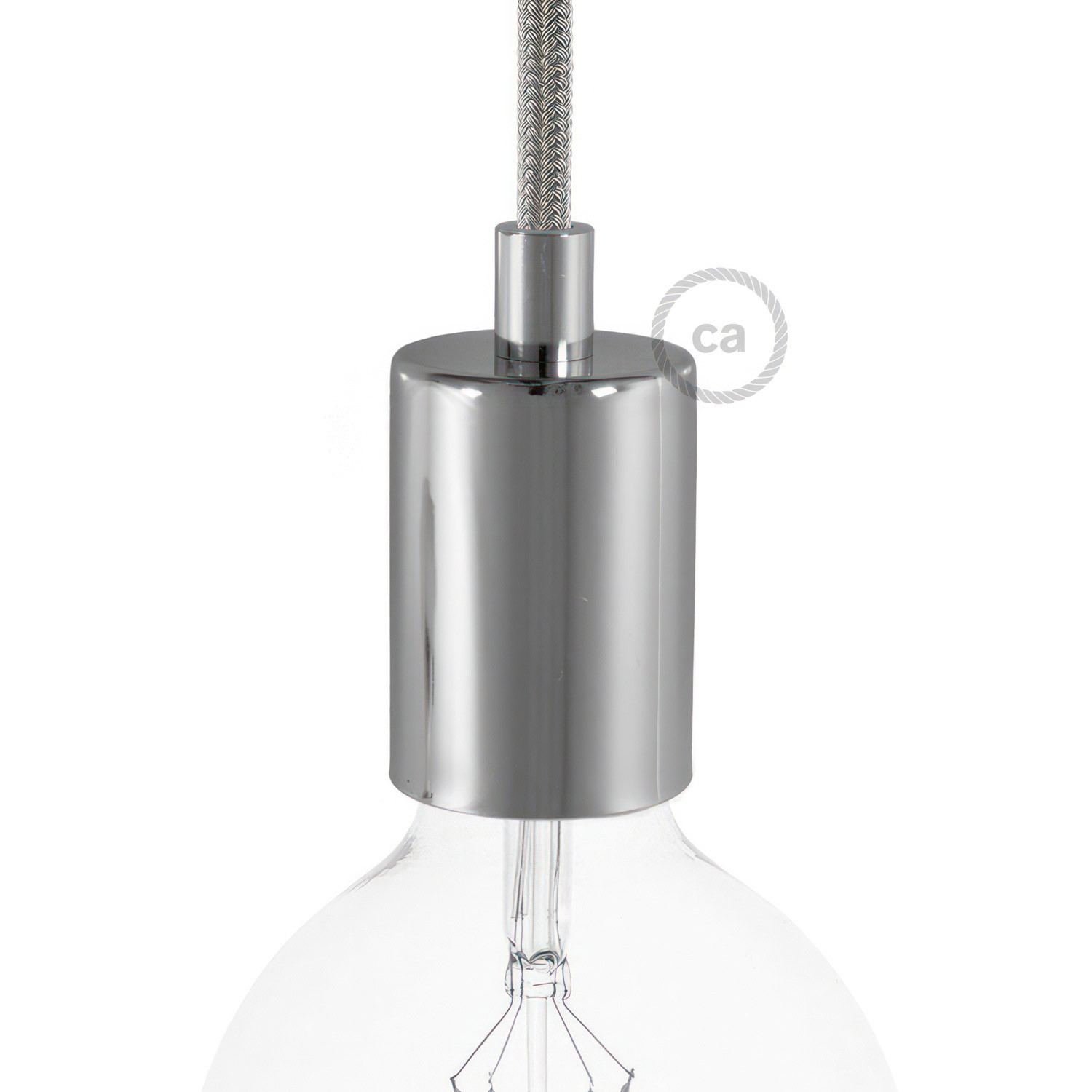Hengeres lámpafoglalat-készlet, amely E27 lámpafoglalatból és hengeres fém kábelbilincsből áll, ideális kedvenc textil kábelével és mennyezeti rozettájával (külön megvásárolható) való használatra.