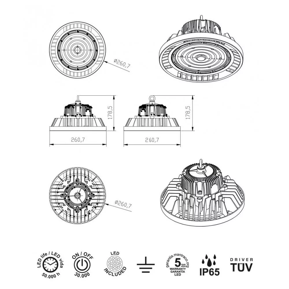 Mantra design lámpa URANO TEK UFO BAY LED FEKETE 150W 5000K 120º 7425 LED IP65 Ø26cm mag 17.8cm