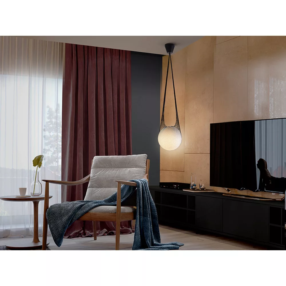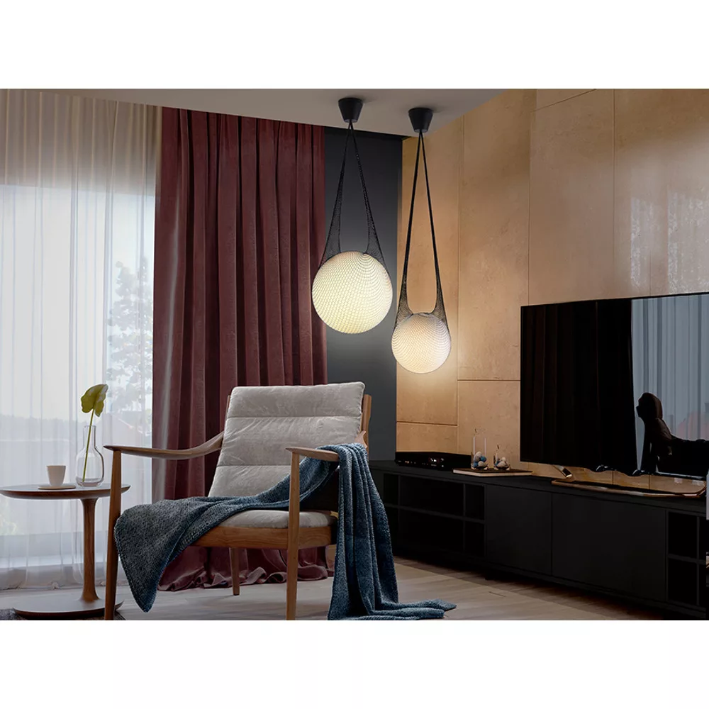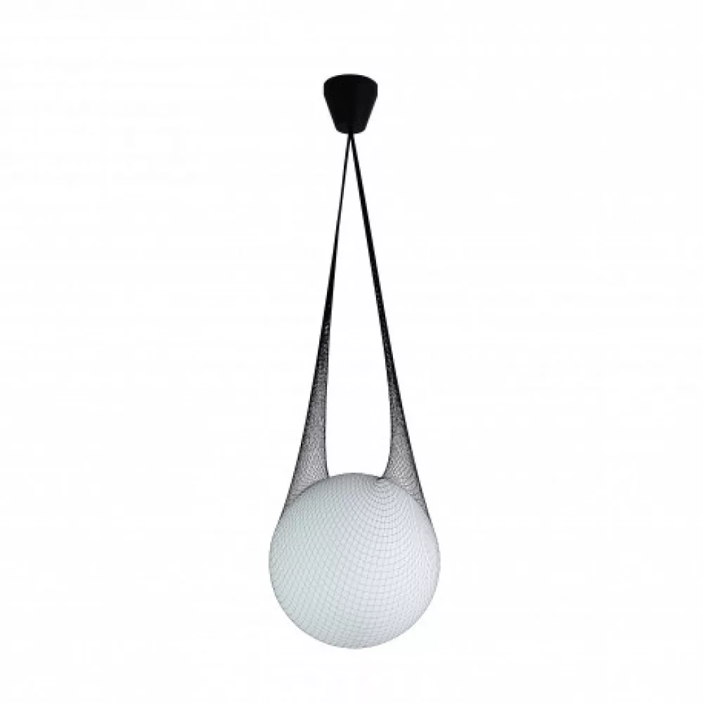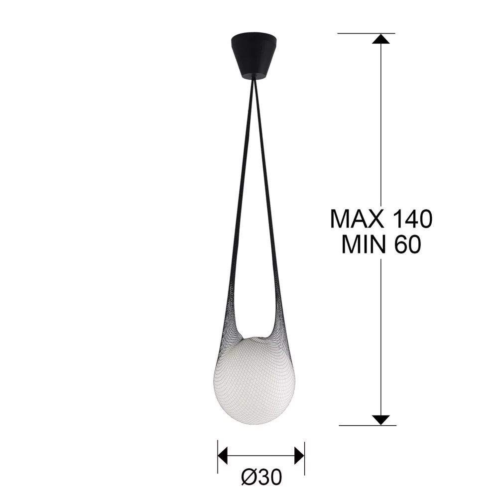 Lámpa gömb alakú opálüveg búrával és fekete hálóval.