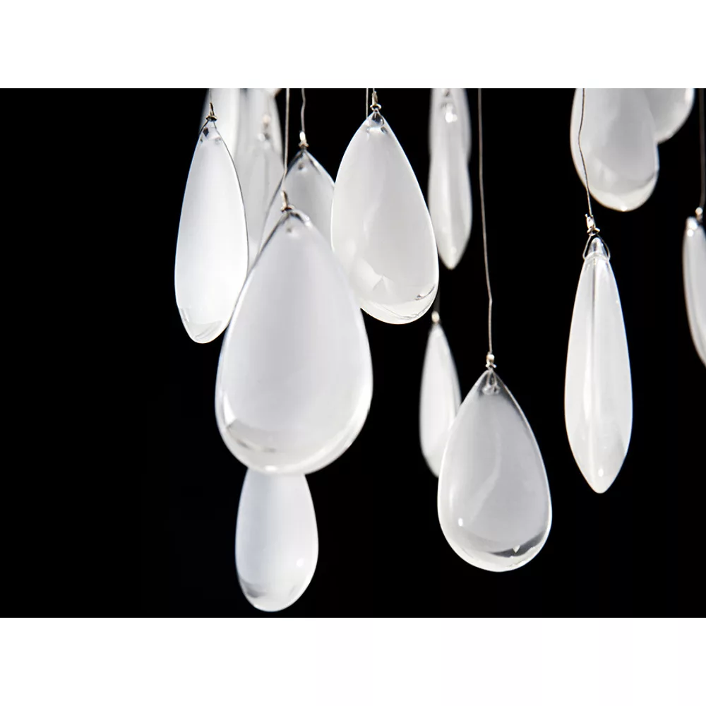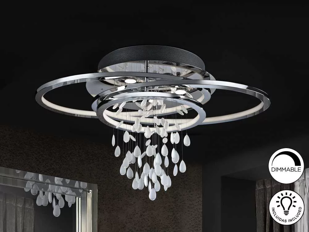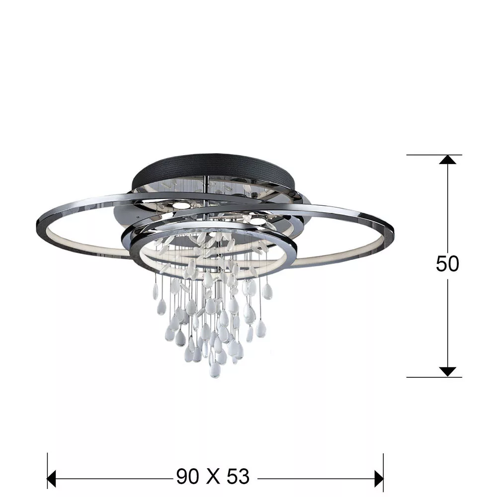 Modern mennyezeti lámpa, fém váz króm felülettel. Benne lelógó fehér kristály dekor elemek. A lámpa formája aszimmetrikus, ovális gyűrűkből áll, azok belső világító fele opál fehér. Meleg fényű, fényerőszabályozható lámpa.
