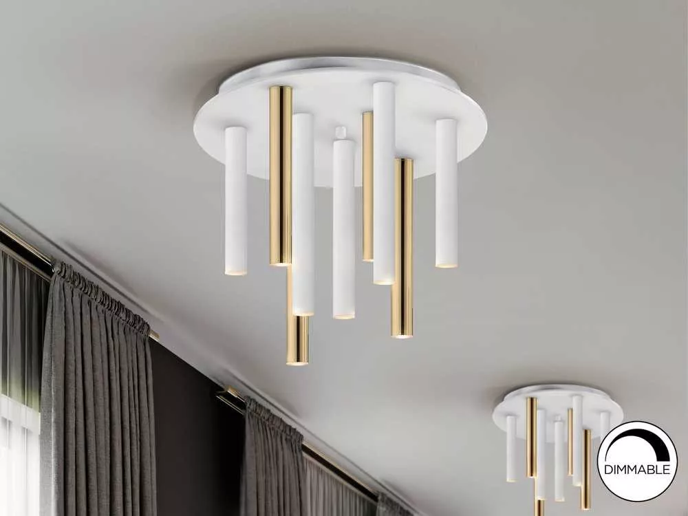 Mennyezeti lámpa 9 lámpafejjel.A fém váz fényes arany és matt fehér felületekkel. Opál műanyag búrák.Fényerőszabályozható.