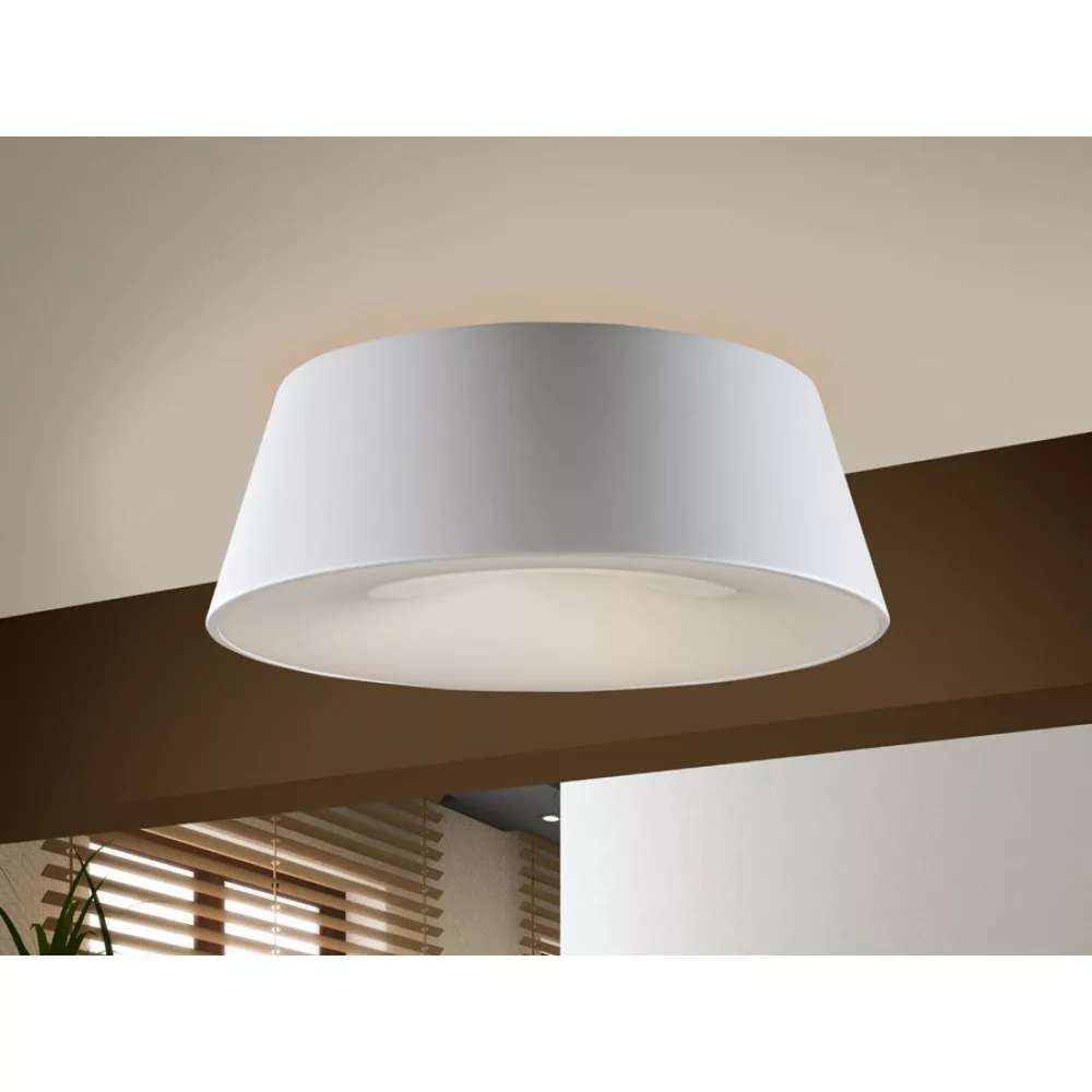 Mennyezeti lámpa lakkozott acélból. Eloxált alumínium búra matt törtfehér felülettel. Öntött akril búra.