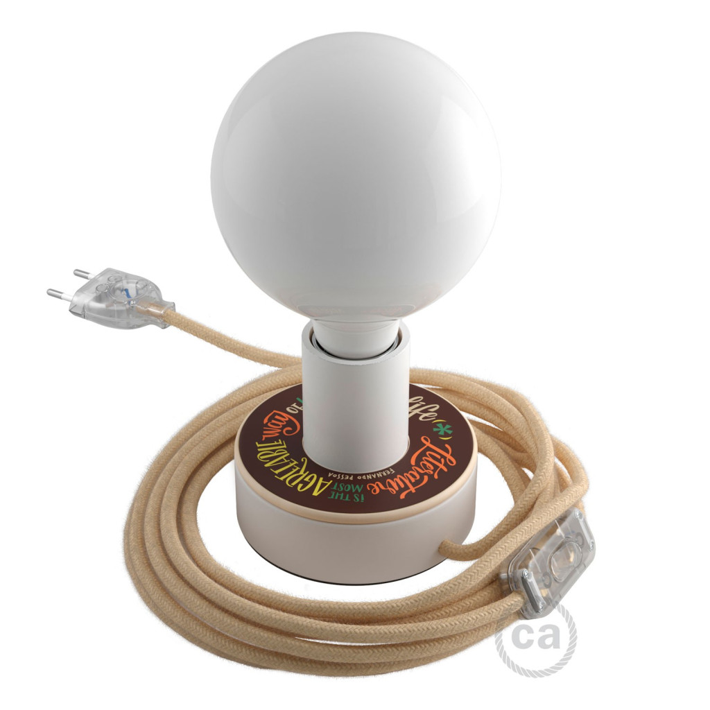 2 x 0,75 Creative-Cables kerek kábel, juta színű szövet borítással, HAR tanúsítvánnyal, olasz gyártmány, 2 méter hosszú (150 cm a dugasztól a kapcsolóig + 50 cm a kapcsolótól a Posaluce-ig)