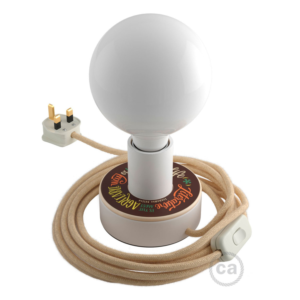 2 x 0,75 Creative-Cables kerek kábel, juta színű szövet borítással, HAR tanúsítvánnyal, olasz gyártmány, 2 méter hosszú (150 cm a dugasztól a kapcsolóig + 50 cm a kapcsolótól a Posaluce-ig)