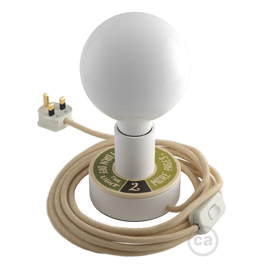 2 x 0,75 Creative-Cables kerek kábel, juta színű szövetborítással, HAR tanúsítvánnyal, olasz gyártmány, 2 méter hosszú (150 cm a dugasztól a kapcsolóig + 50 cm a kapcsolótól a Posaluce-ig)
