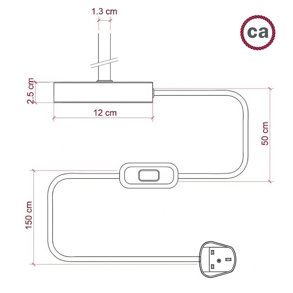 Kerek Creative-Cables kábel szövetborítással: 2 méter (150 cm a foglalattól a kapcsolóig + 50 cm a kapcsolótól az Alzaluce-ig) 2x0,75, HAR tanúsítvánnyal. Olaszországban gyártva