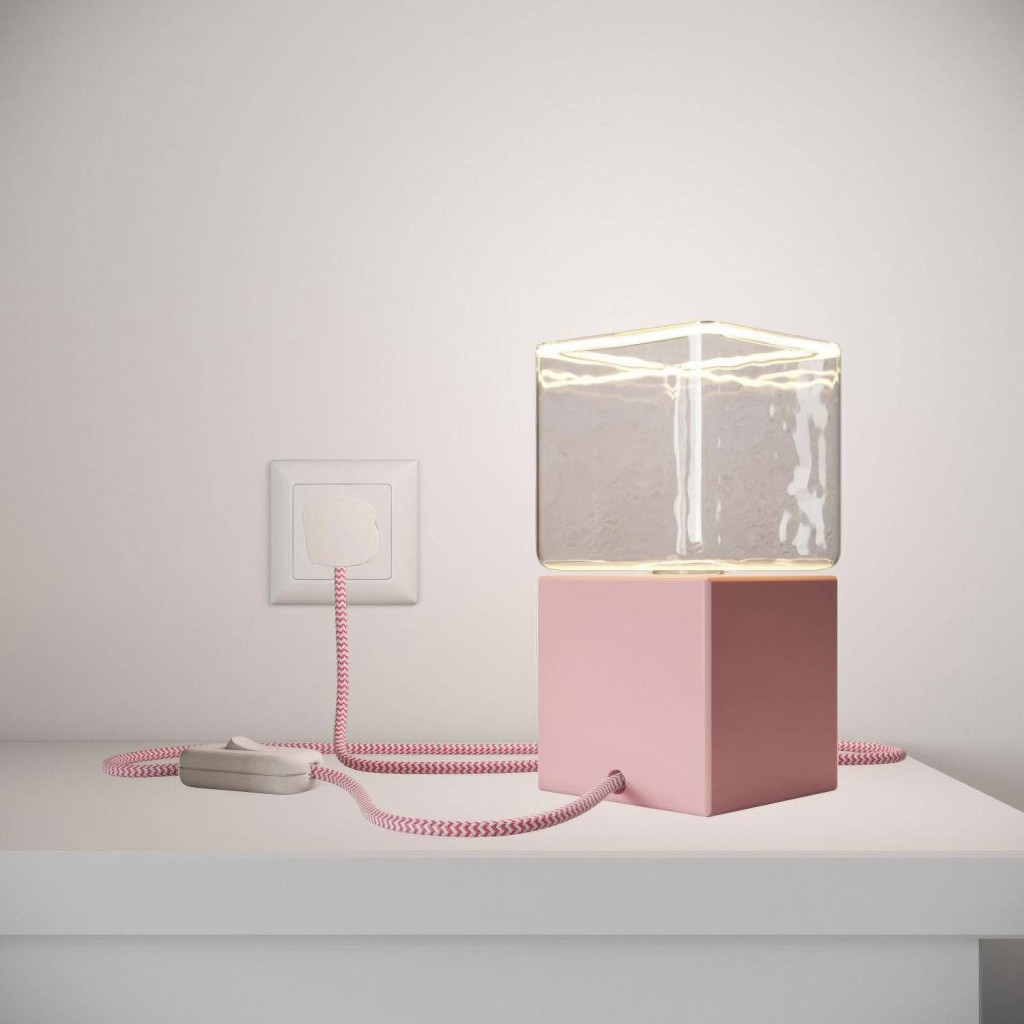 Creative Cables textil lámpakábel Posaluce Cubetto Color, festett fa asztali lámpa, textilkábellel, kapcsolóval és ABWLINB3015RZ08
