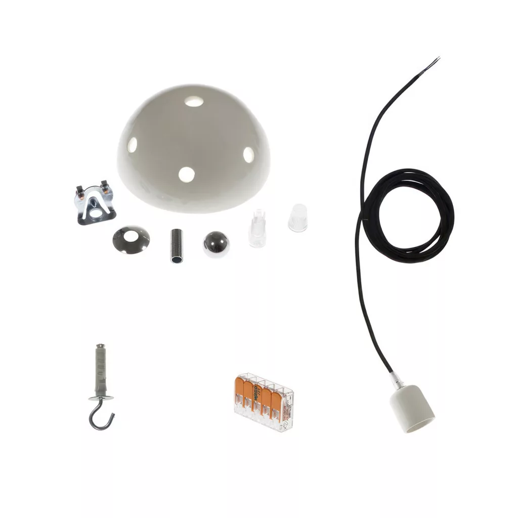 - Kerámia mennyezeti rozetta Ø 120 mm, mennyezeti rögzítő rendszerrel, 1 menetes csővel, 1 komplett átlátszó kábelbilinccsel. 1 menetes mennyezeti kampó, 1 krómozott gömb alakú végződés, amely akkor használható, ha a központi lyuk nem kerül felhasználásra.